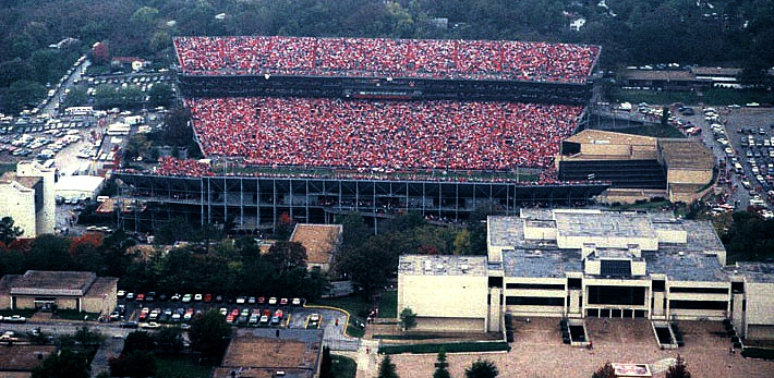 Razorback Stadium, 1980s Next → A view of Razorback Stadium’s expanded second deck in the late 1980s. The current student union (bottom left) still had its original facade then.