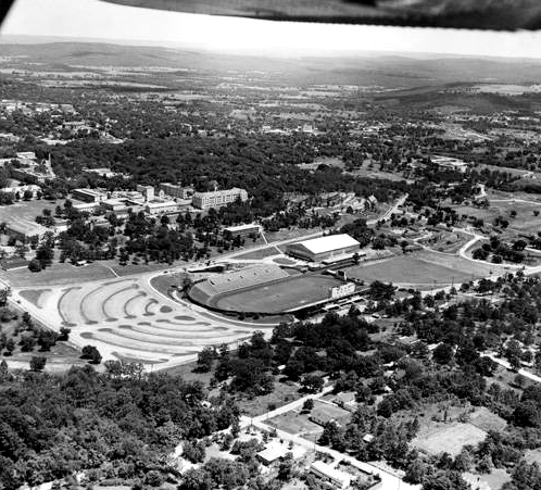 Razorback Stadium, 1955 ← Previous Next → An aerial view of Razorback Stadium, circa 1955. At the south end of the stadium is Barnhill Field House (later Barnhill Arena), which opened a year earlier.