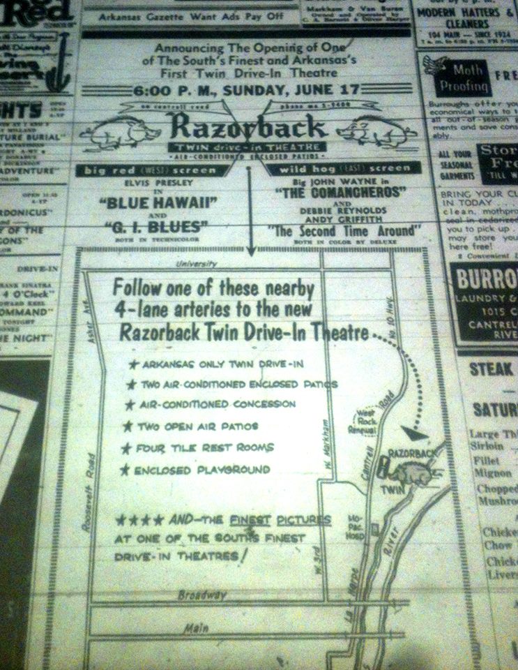 Razorback Twin Drive-In, 1962-1980 ← Previous Next → This near full page ad in the June 17, 1962 edition of the Arkansas Gazette announced the grand opening of the “South’s finest and Arkansas’ first twin drive-in theater.” Image via Arkansas Gazette.