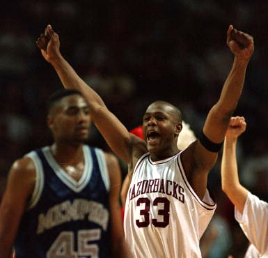 Arkansas needed overtime against Syracuse and Memphis to reach the Elite 8. In the second round against Syracuse, the Hogs turned the ball over with under five seconds to play, but the Orange bailed out the Razorbacks by calling a timeout they didn’t have. Thurman hit one of two free throws to send the game into overtime, where the Hogs eventually won 96-94.