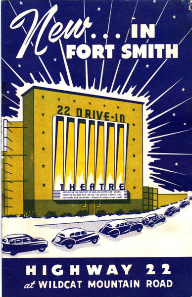 Route 22 Drive-In, 1950-1970s Cars form a long line while waiting to see a movie in this brochure advertising the Route 22 Drive-In, 3215 S. 74ht St. in Fort Smith. Image via Drive-Ins.com.