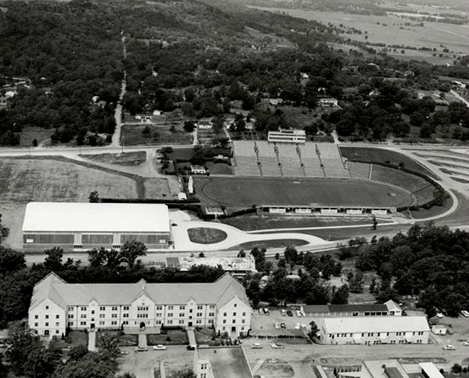 This 1955 photo shows a recently completed Barnhill Fieldhouse adjacent to the south endzone of Razorback Stadium. Funding for the new facility came primarily at the behest of Gov. Francis Cherry, who was described in the 1954 Razorback as a “frequent visitor” to the Hill who “rarely misses a Razorback football game which is in or near Arkansas.”