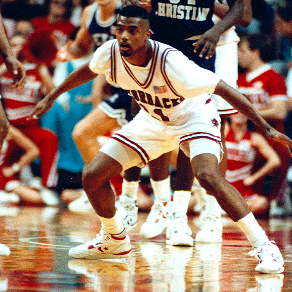 Richardson’s Hogs returned to the NCAA Tournament in 1989, buoyed by stellar freshman triumvirate of Todd Day, Lee Mayberry, pictured above, and Oliver Miller. Richardson now had “triplets” of his own, who would cap Arkansas’ tenure in the SWC in dominating fashion. In their first season together, the trio helped secure Richardson’s first SWC championship.