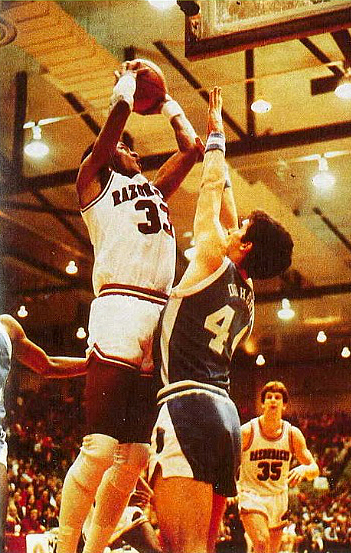 Delayed by bad weather, Arkansas didn’t arrive in Pine Bluff until two hours before tip off. The Hogs had been in Dallas a day earlier for a game against SMU. Urged to play loose and forget the national spotlight, Arkansas kept Michael Jordan and his 19-0 Tar Heels in check, taking a 38-34 lead at halftime.