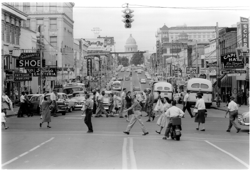 Capitol Theater, 1920s-???? A view of the Capitol Theater, 600 Main St. in Little Rock, in 1958. The theater’s vertical marquee is in the upper right of the picture (look at the capitol and then pan to the right). Image via Cinema Treasures.