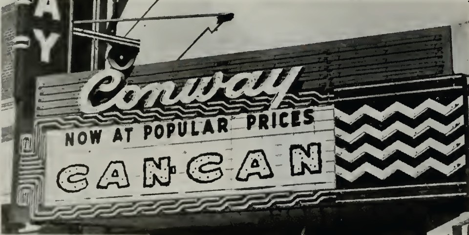 Conway Theater, 1930s-1974 A close-up of the Conway Theater’s marquee in 1961. Image via Box Office Magazine.
