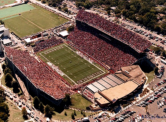 Razorback Stadium, 1980s An aerial view of Razorback stadium after Arkansas added lights. The photo was probably taken in the early 1990s.