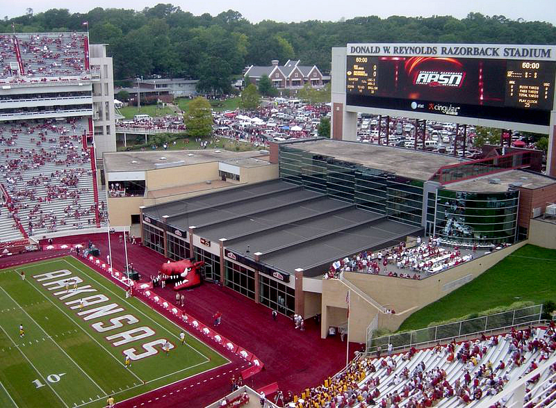 Razorback Stadium, 2000s The new video board, installed in time for the 2000 season, measures 30×107 feet. At one time, it was the largest LED scoreboard of any stadium in the country. Legend says you can see it from space.