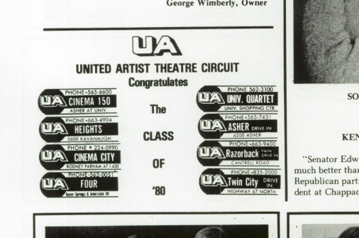 UA Cinemas, 1980 United Artists dominated the Little Rock market, as evidenced by this clipping from the 1980 Little Rock Central High yearbook, The Pix. Image via The 1980 Pix.